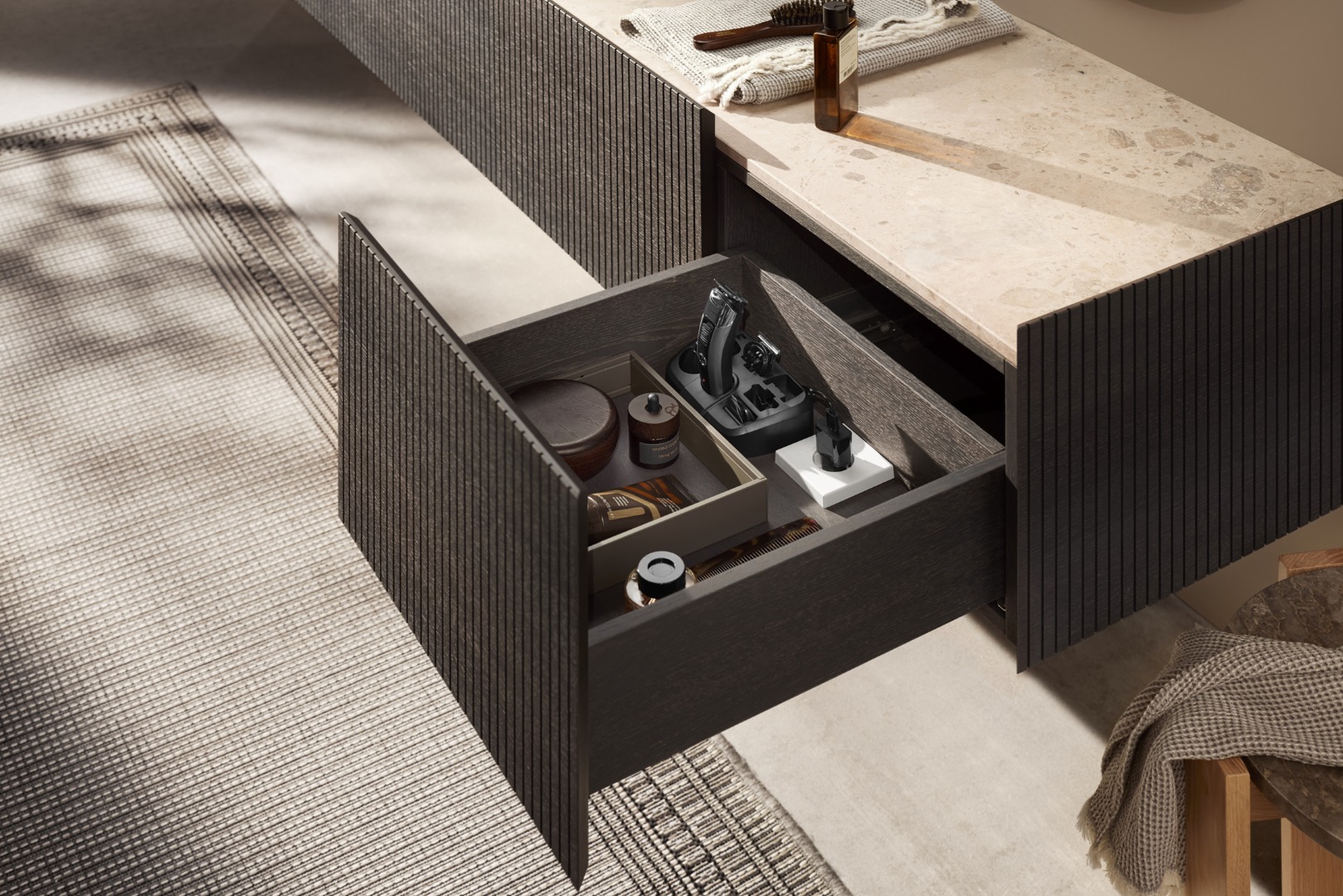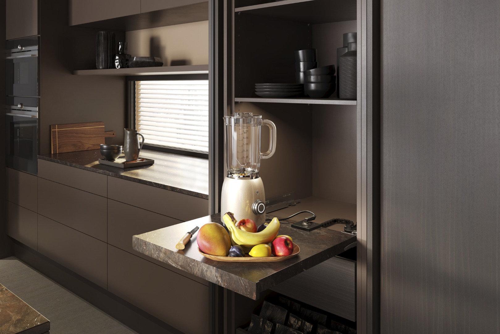 - Oculta tomadas de forma elegante em gavetas e prateleiras extraíveis