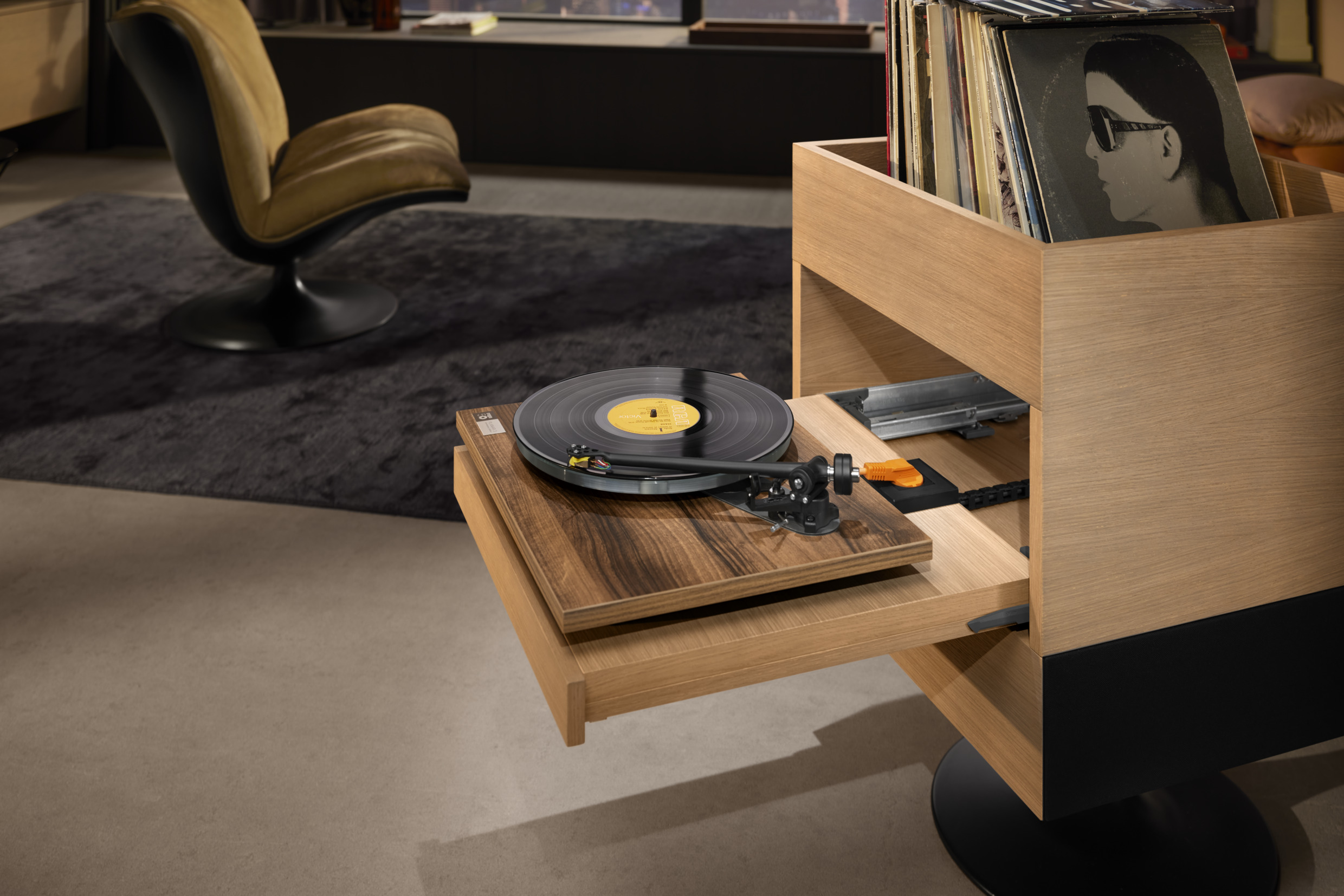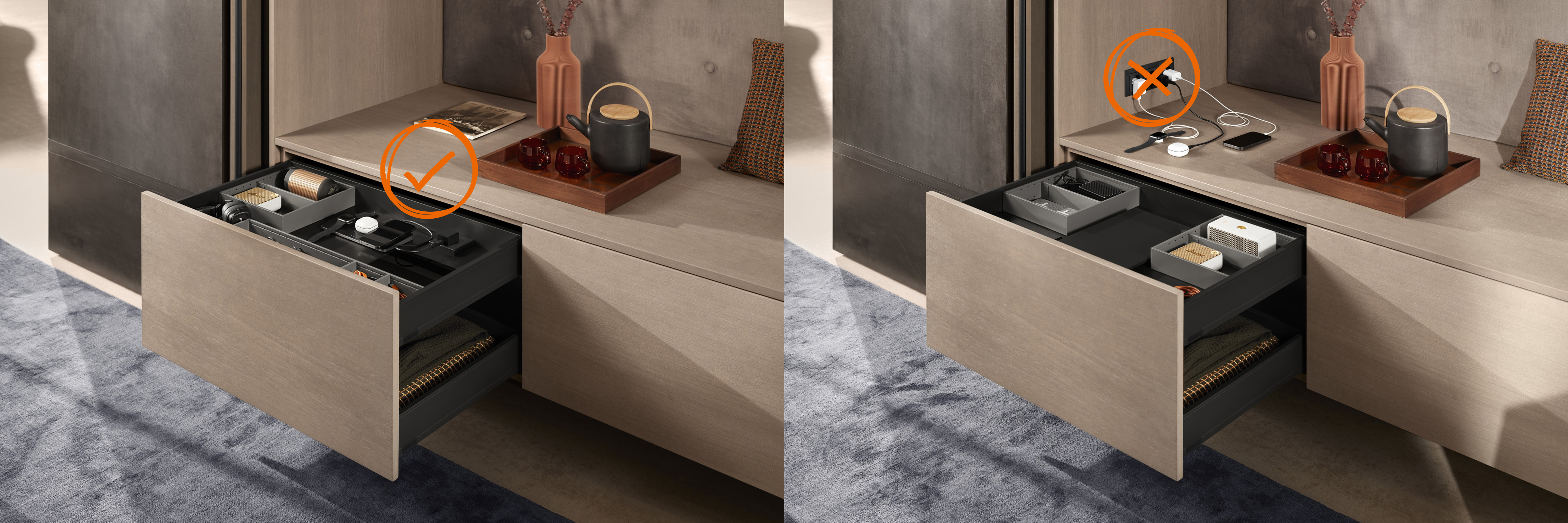 Graças à tomada embutida, os dispositivos eletrônicos podem ser facilmente escondidos em gavetas ou prateleiras extensíveis sem desperdiçar espaço. Isso mantém as superfícies de trabalho livres, transformando o habitual emaranhado de cabos em coisa do passado.