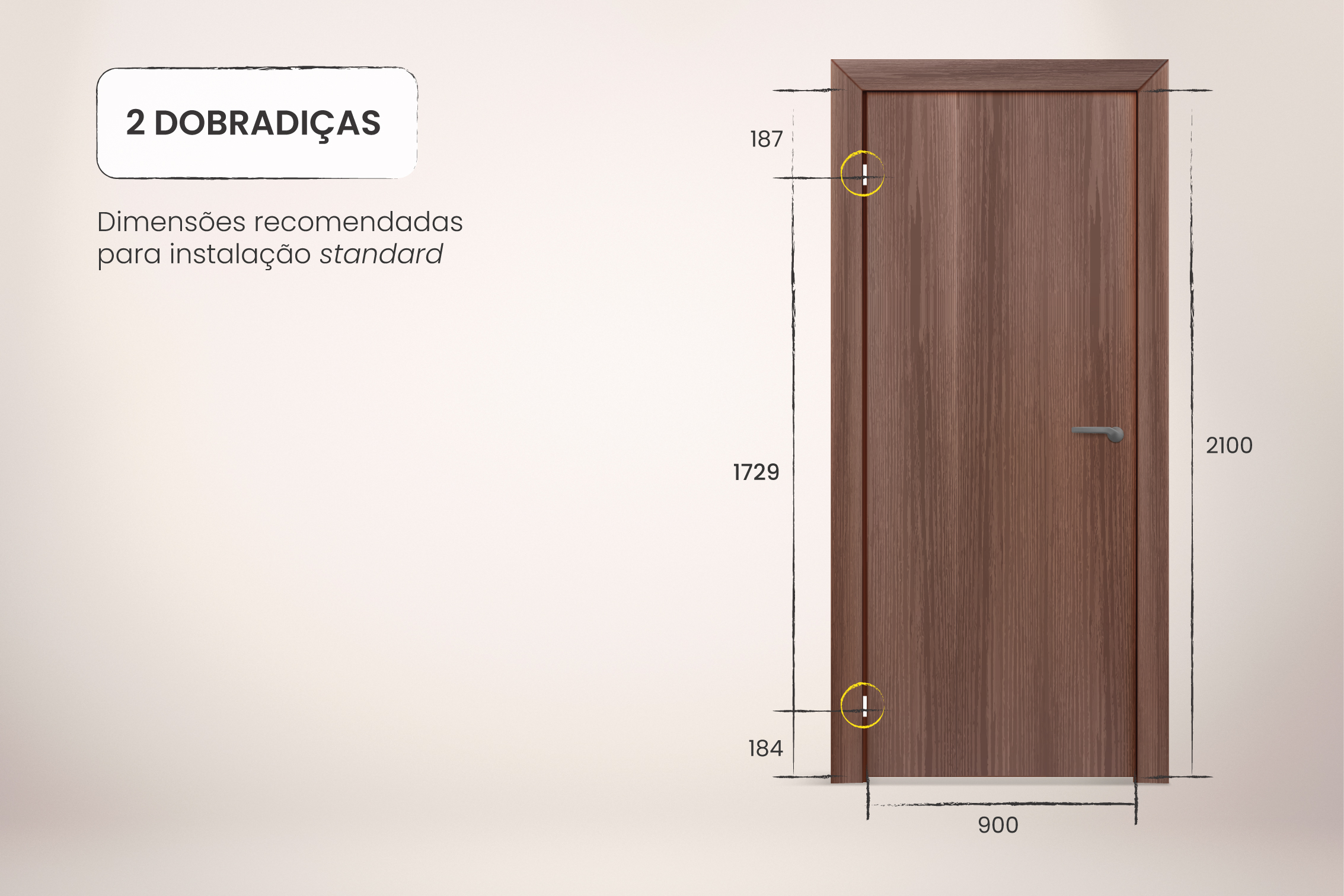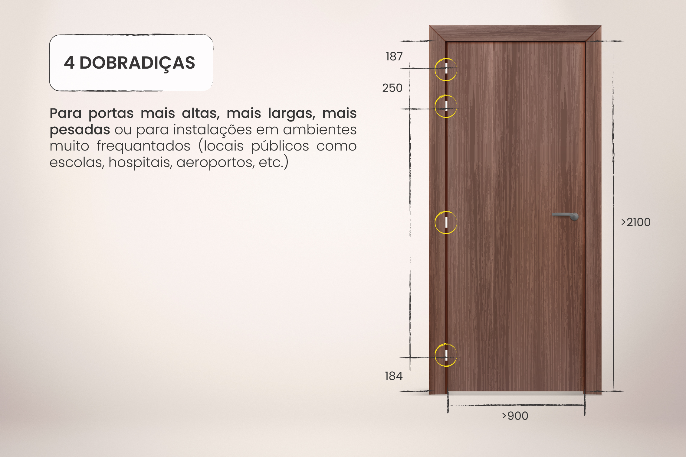 O número de dobradiças a instalar na sua porta não é uma escolha, mas sim uma regra. Para que as dobradiças cumpram com a sua função é necessário entender quais as dimensões, pesos, materiais e circunstâncias da sua porta. Em baixo pode ver esquemas de montagem para situações em que é necessário a aplicação de duas (standard), três ou mesmo quatro dobradiças.