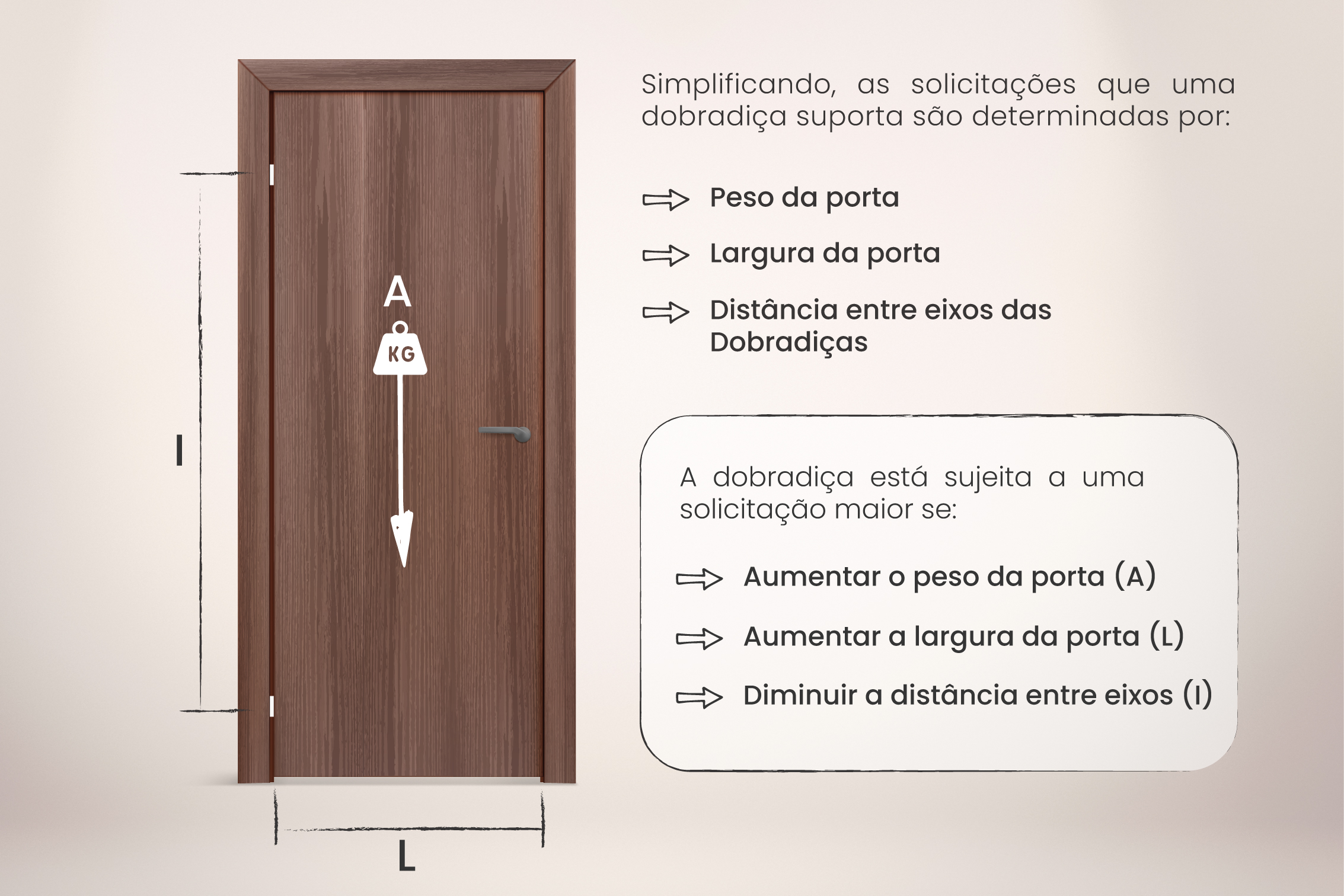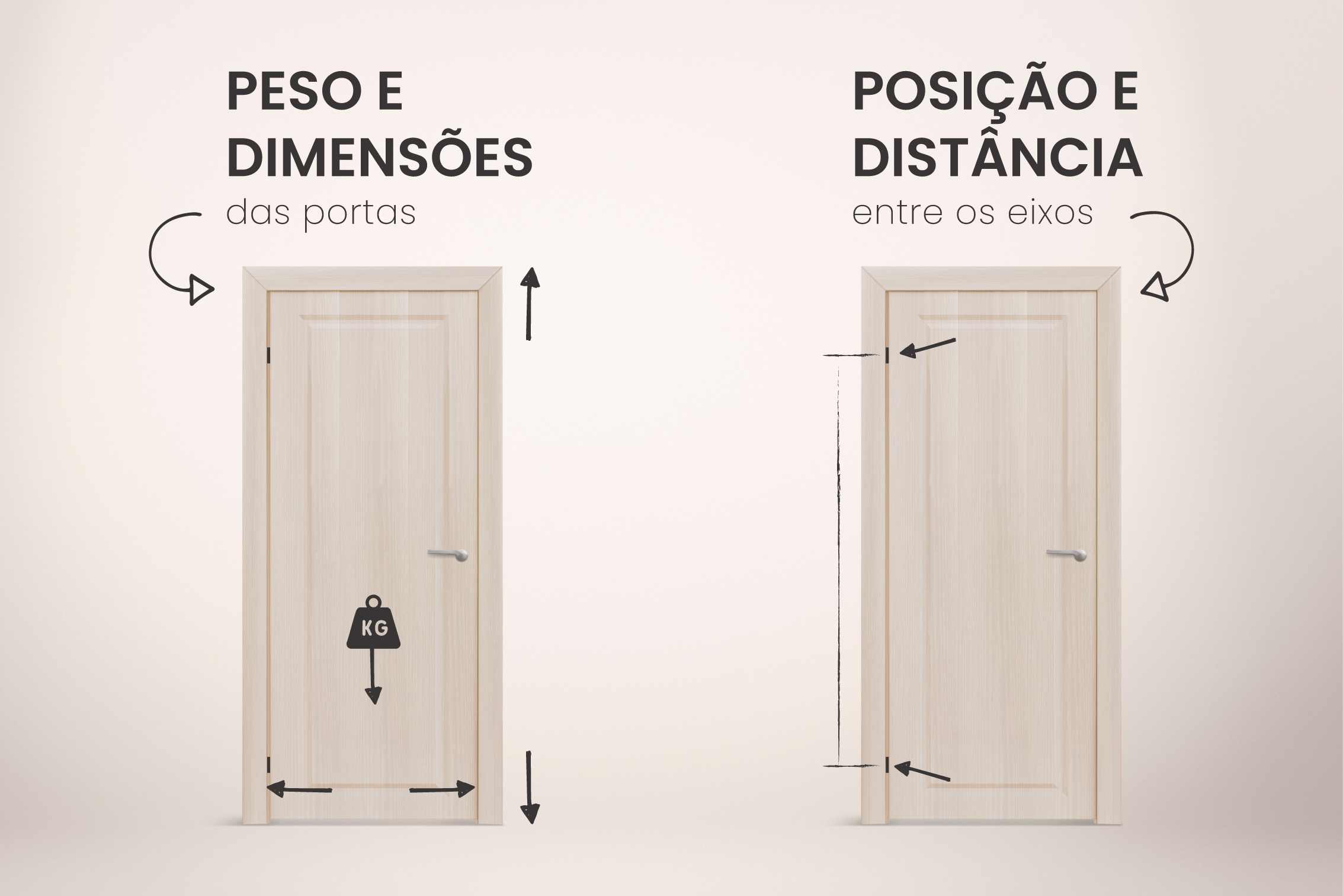Um dos primeiros aspetos a avaliar é o peso e as dimensões da porta. Esses fatores determinam a capacidade de carga que a dobradiça precisa suportar. Para identificar o modelo ideal, é importante conhecer o peso exato da porta, a sua largura e a distância entre os centros das dobradiças. De forma geral, quanto maior o peso ou a largura da porta, maior será a pressão exercida sobre as dobradiças.
