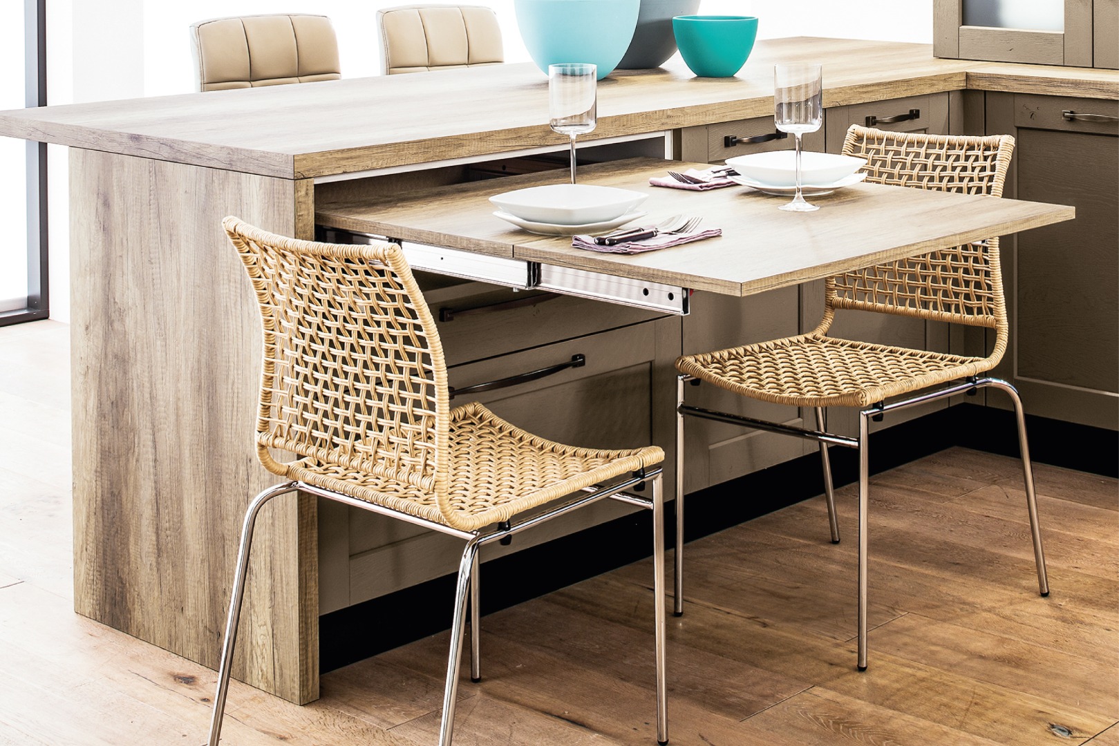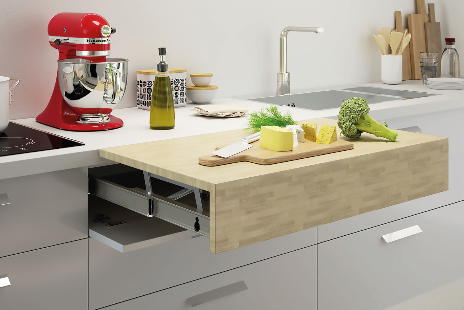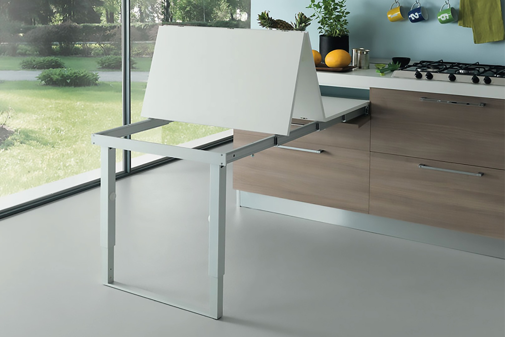 As nossas soluções para corrediças de mesa são ideiais para quem pretende fazer uma refeição ou trabalhar numa superfície pouco convencional, sendo um elemento que deixa o ambiente mais contemporâneo, tanto estética, como funcionalmente. Quando abertas, oferecem uma superfície adicional para refeições rápidas, preparação de alimentos ou até mesmo como um apoio extra. Quando fechadas, mantêm a bancada limpa e organizada, podendo ocultar fogões, lava-louças ou outros elementos da cozinha.