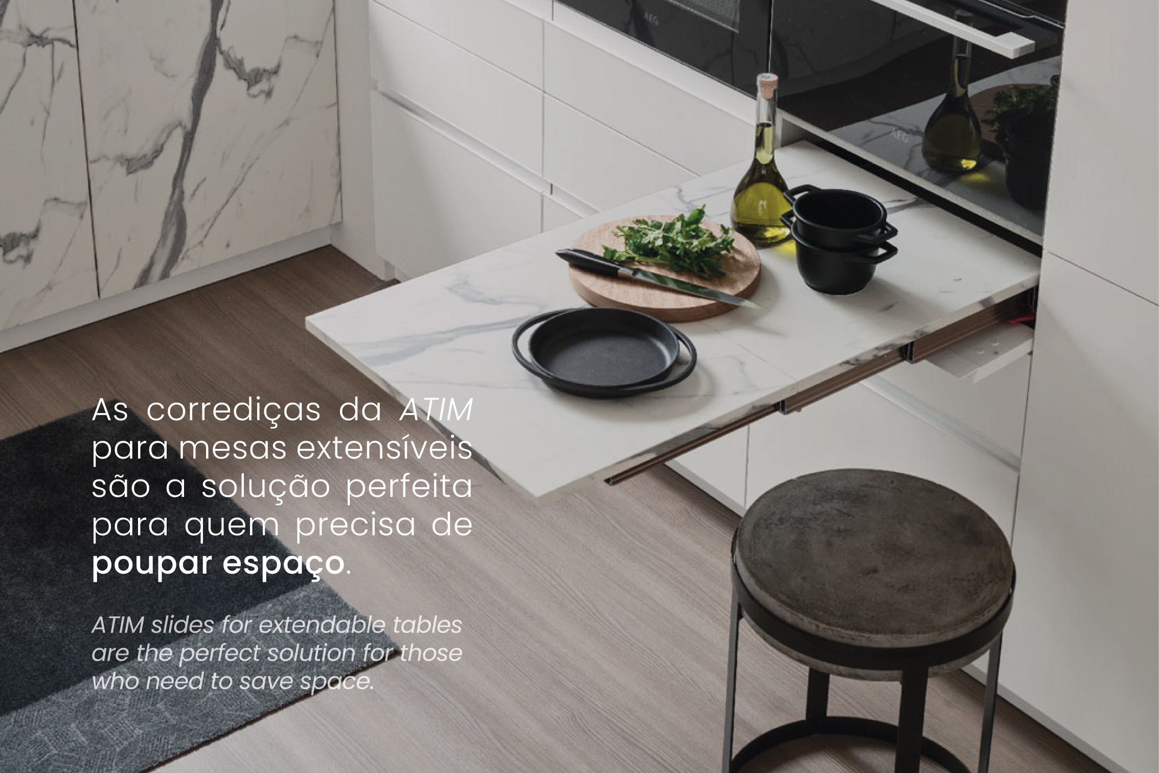 O design é outro ponto forte. Graças aos seus acabamentos limpos e contemporâneos, estas corrediças de mesa integram-se de forma harmoniosa ao ambiente, valorizando cozinhas minimalistas e sofisticadas. Uma vez que não ocupam espaço extra quando estão recolhidas, são especialmente recomendadas para apartamentos pequenos, cozinhas compactas ou ambientes multifuncionais. A facilidade com que podem ser manuseadas reforça o seu caráter prático e ergonómico.