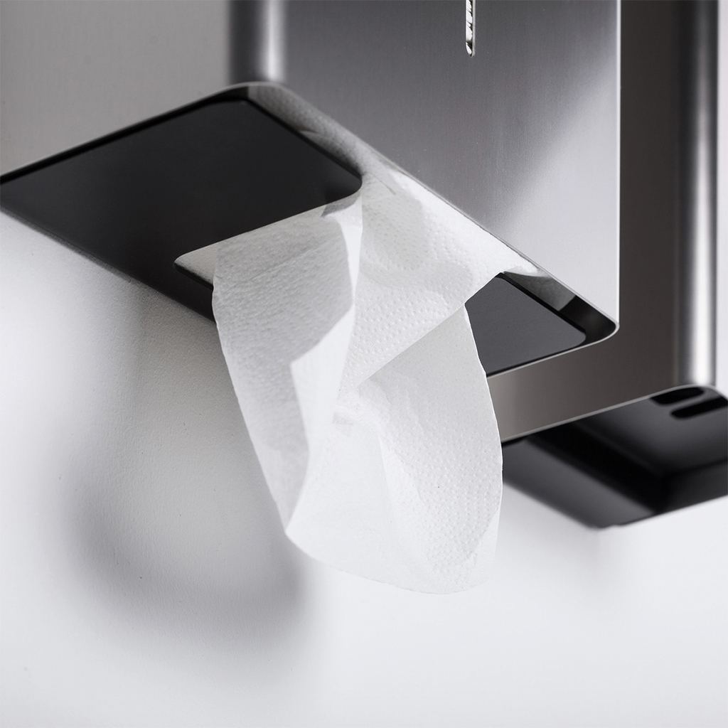 Dispensador de toalhas de papel com visor para controlo de quantidade.