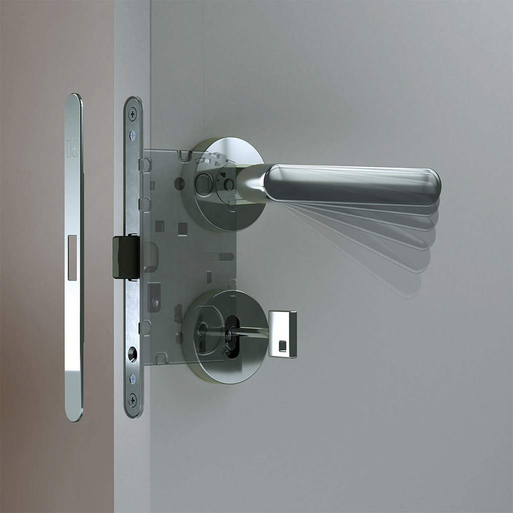 A SpinOff é uma fechadura para WC magnética com duas quadras, da série premium lançada pela Koblenz, de embutir de passagem.