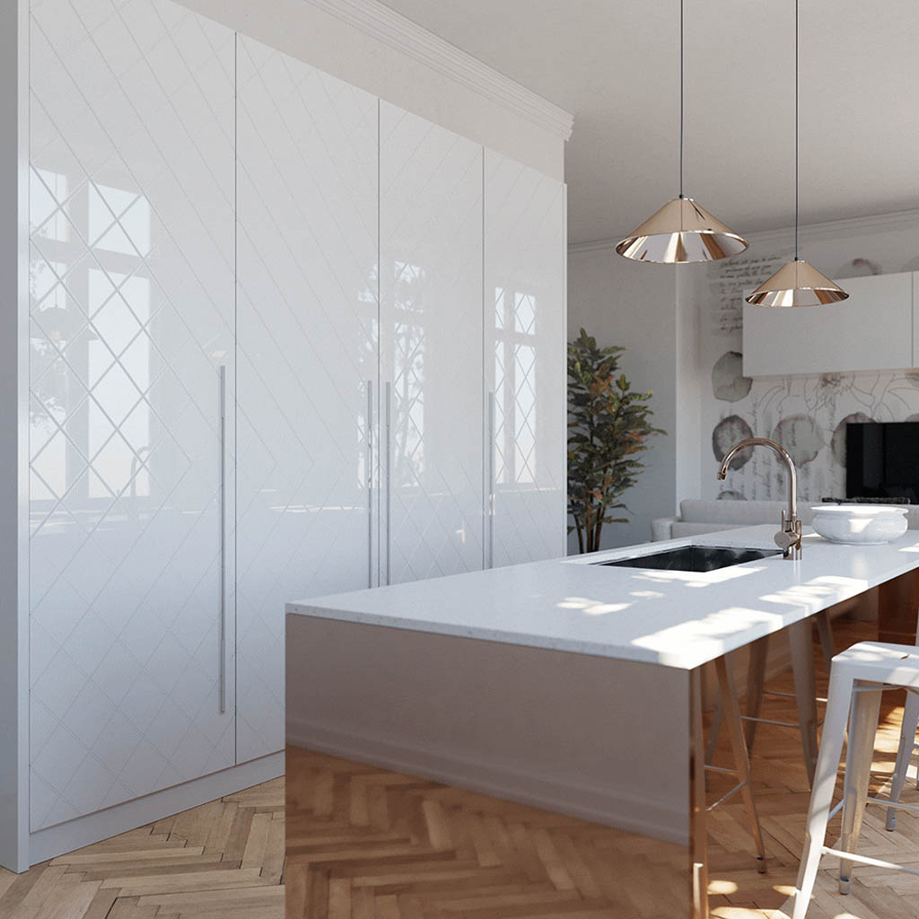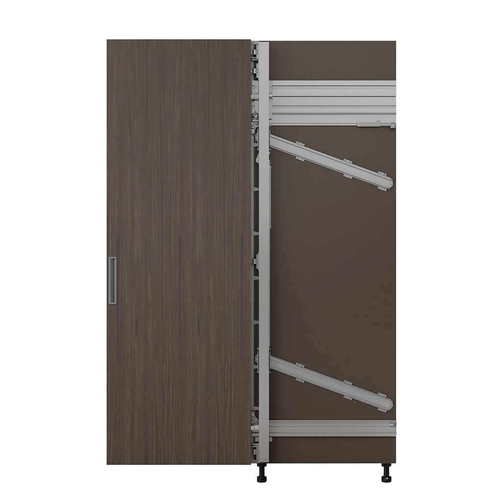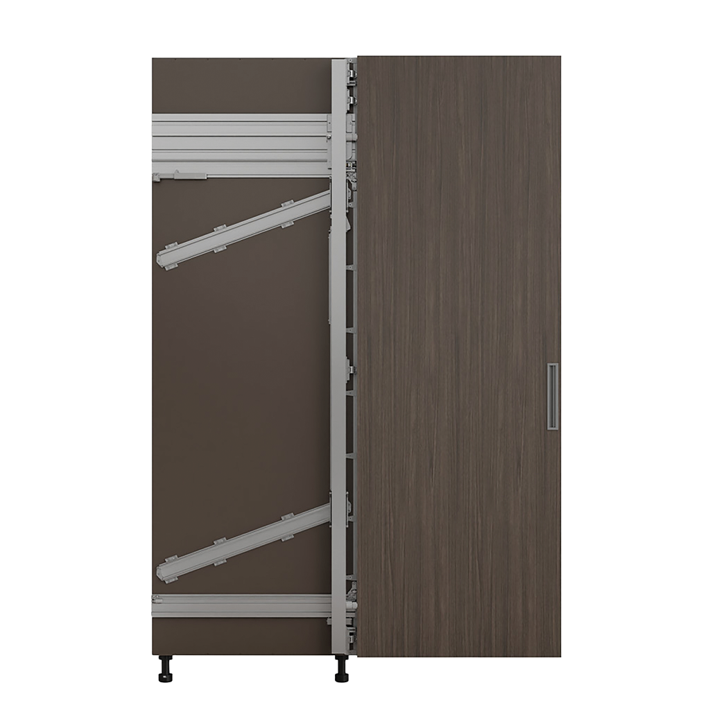 O mecanismo de deslizamento é invisível, contido em um vão de apenas 55 mm, facilmente ajustável e acessível sem a necessidade de desmontar o móvel.