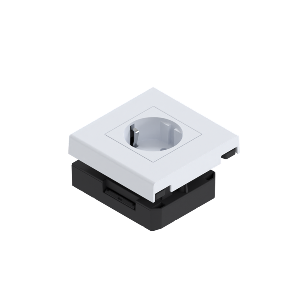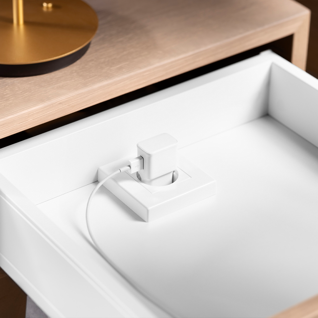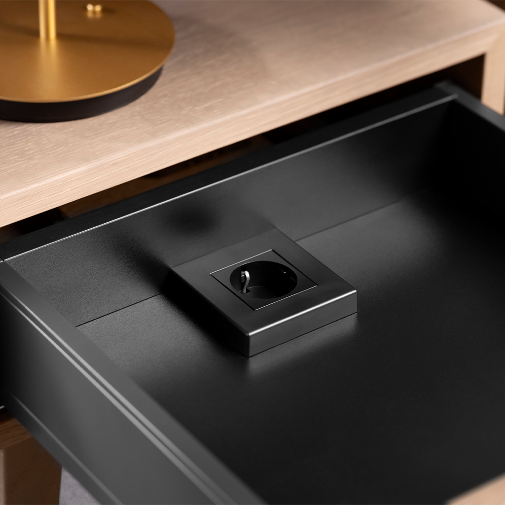 AMPEROS AC, uma solução de tomada (230V) concebida para oferecer discrição, ocultando elegantemente os componentes elétricos no interior de gavetas ou prateleiras.