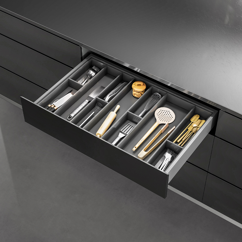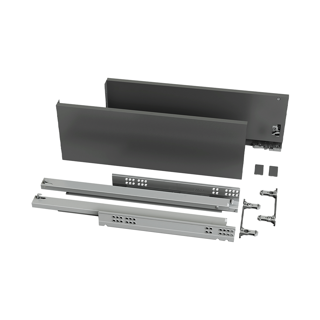 Gaveta TEK FIT com laterais finas de 175mm de altura, com amortecedor e ajuste 3D.