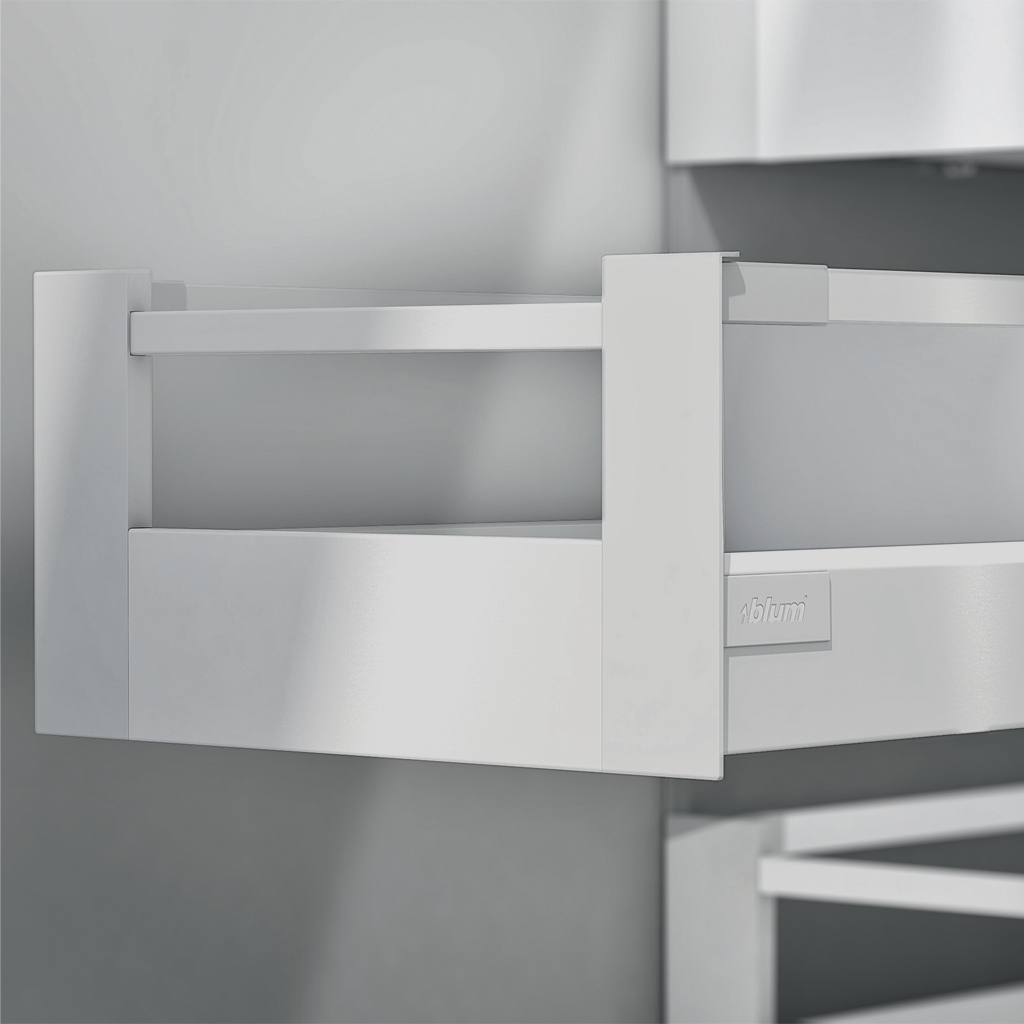 Gavetão interior TANDEMBOX da Blum, lateral metálica de 83mm de altura com cerco altura total 224mm, frente e cerco frontal metálicos.